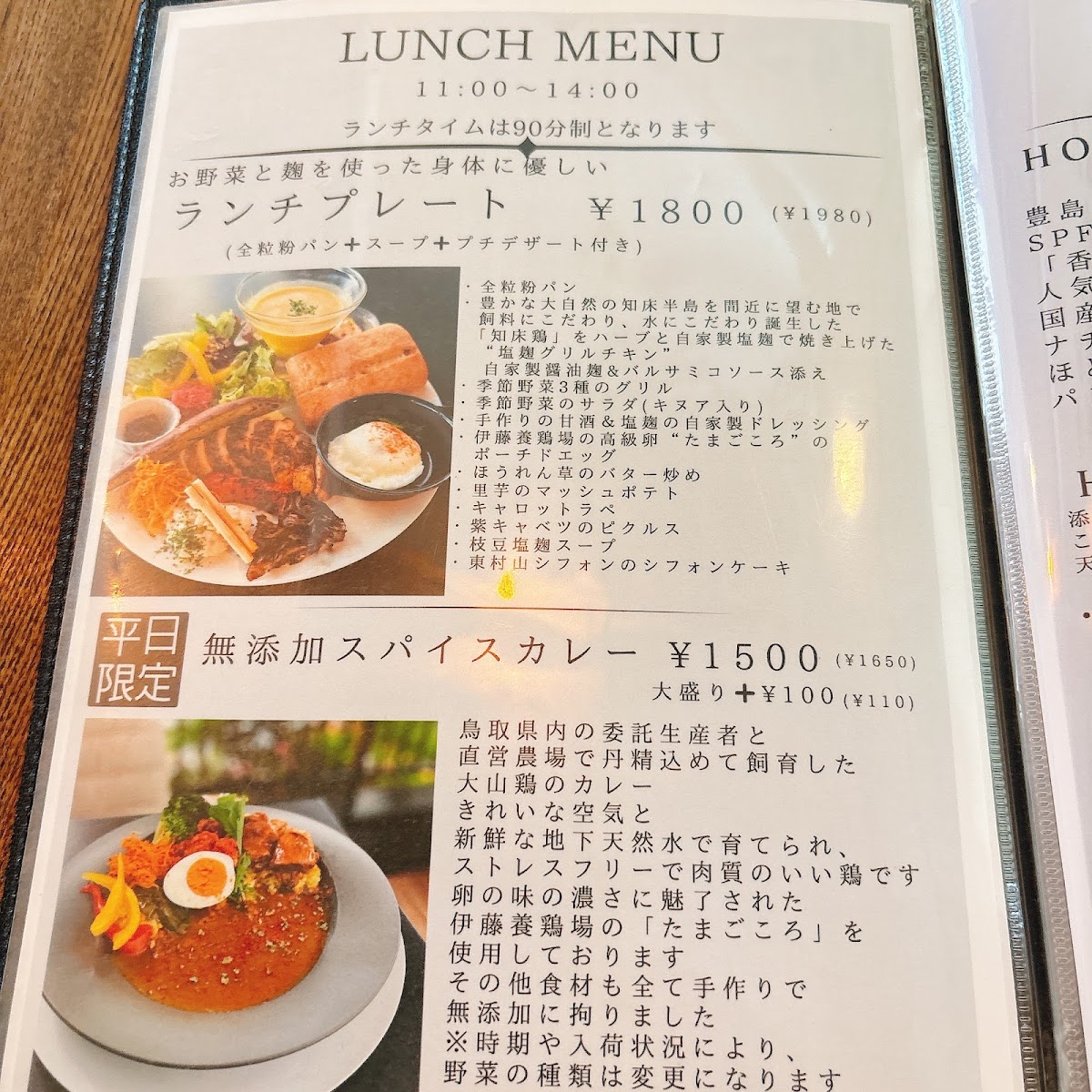 ランチプレート SPF豚協会認定養豚場の「香り豚」をメインに、地場野菜にこだわったプレートです。 旬なお野菜を使って手作りしていますので、入荷状況などで内容が変わる場合も御座いますのでご理解下さい。 卵の味の濃さに魅了された立川市の伊藤養鶏場「たまごころ」を使用しています。 ランチプレートの内容は季節により変更する場合がございます。